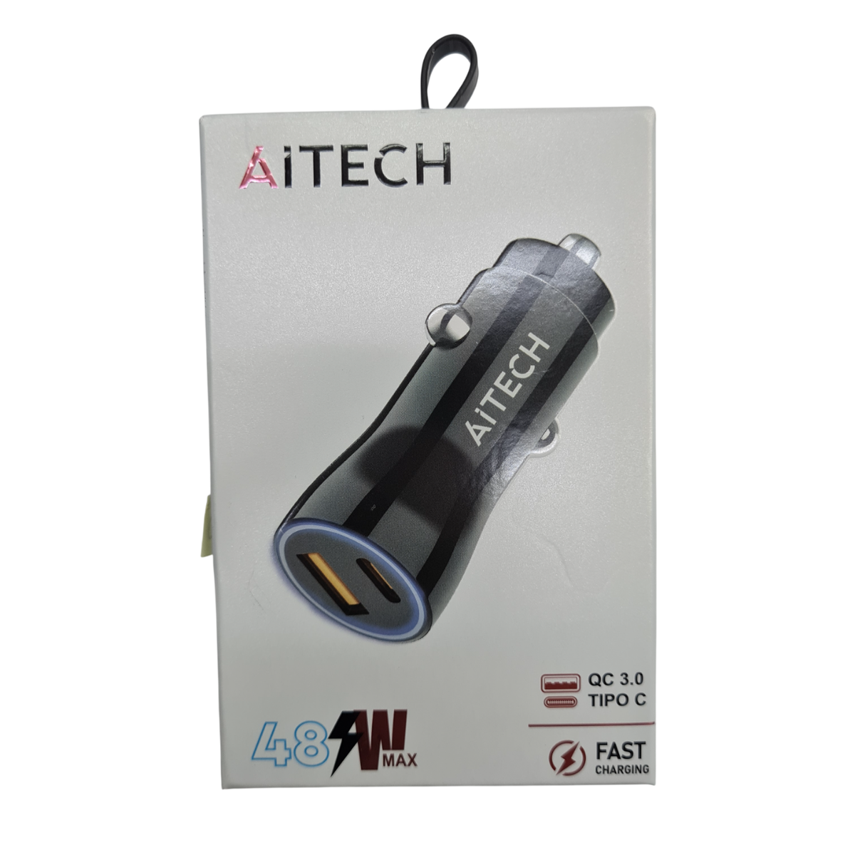 Cargador para auto Aitech 48W con tecnología de carga rápida, ideal para mantener tus dispositivos siempre con batería mientras viajás. Compatible con autos de 12V, permite cargar celulares, tablets y otros dispositivos de forma eficiente.