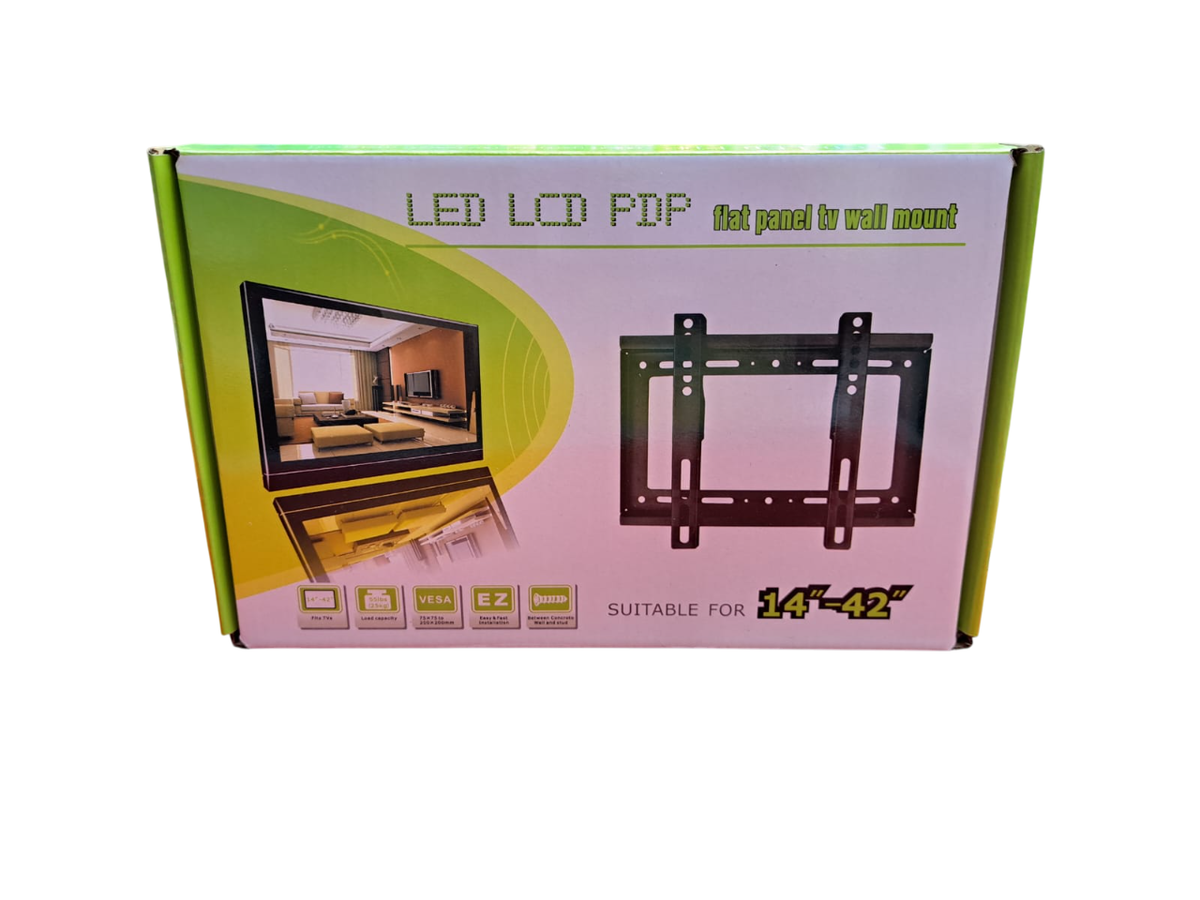 Soporte para TV fijo compatible con pantallas de 14 a 42 pulgadas, ideal para instalar televisores LCD o LED de forma segura y práctica. Diseñado para soportar hasta 25 kg, brinda estabilidad y firmeza, optimizando el espacio en tu hogar o negocio.