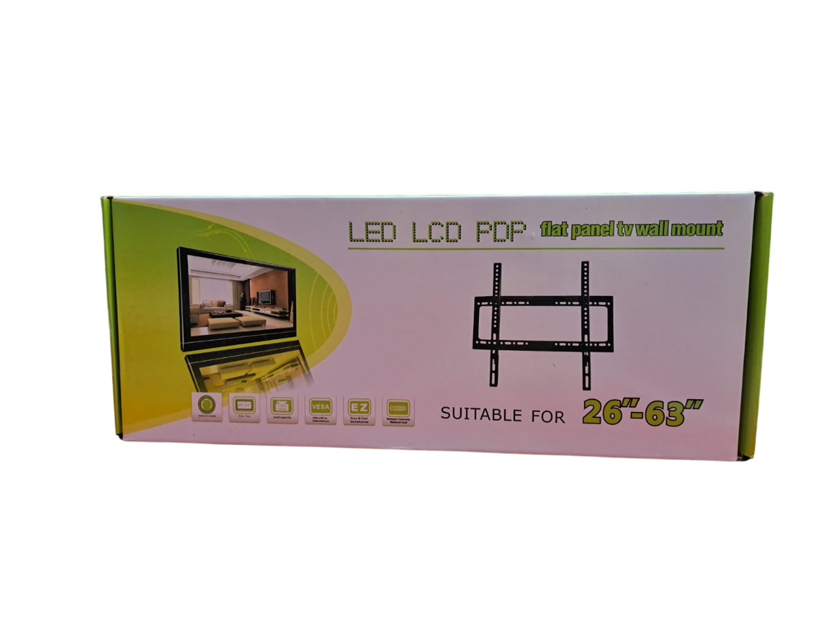 Soporte para TV fijo compatible con pantallas de 26 a 63 pulgadas, ideal para instalar televisores LCD o LED de forma segura y práctica. Diseñado para soportar hasta 50 kg, brinda estabilidad y firmeza, optimizando el espacio en tu hogar o negocio.